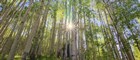Sun Rays Shining Through Foggy Pine Trees