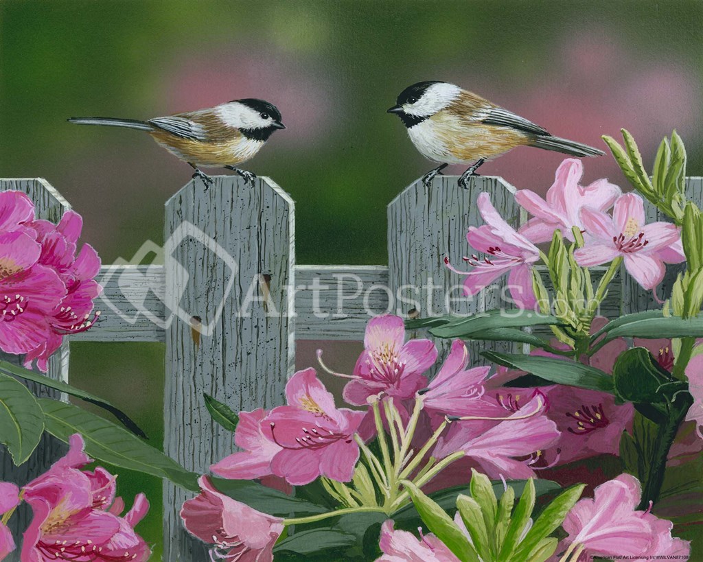 Two small cute birds standing on a old fence surrounded with beautiful flowers