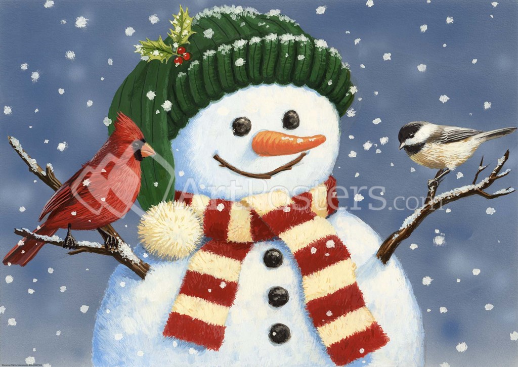 Snowman With Cardinal And Chickadee by William Vanderdasson art print