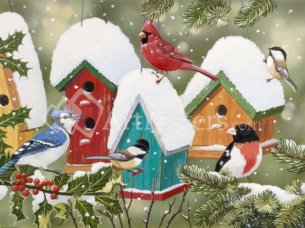 Bird houses of different colors on a snowy day