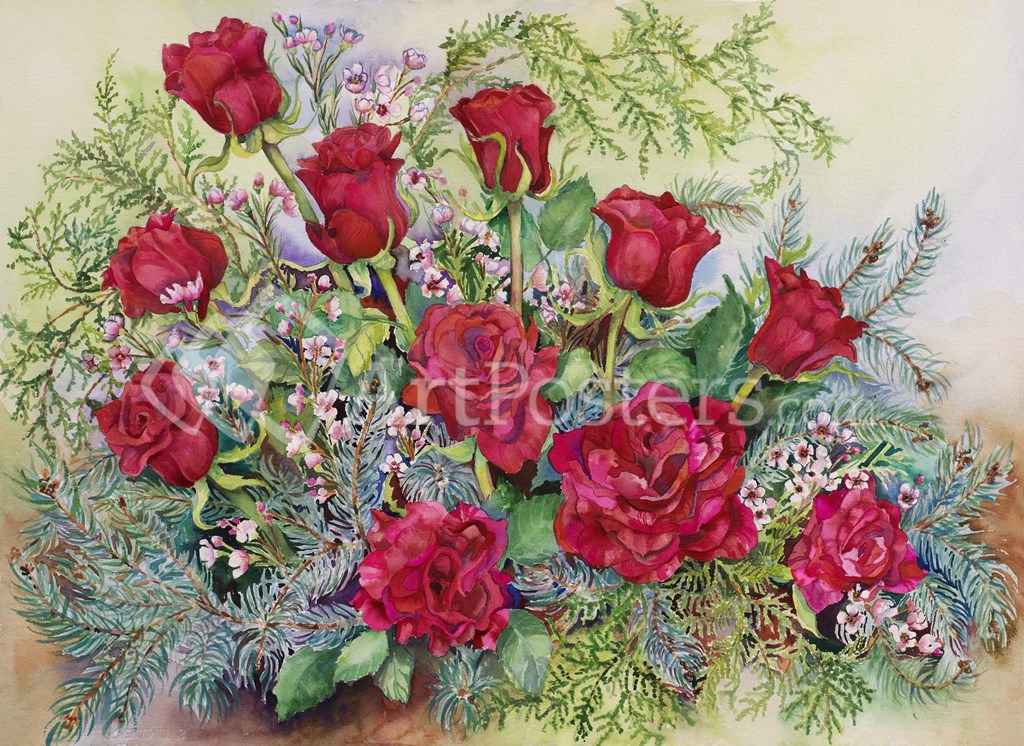 Red Roses With Evergreens by Joanne Porter art print