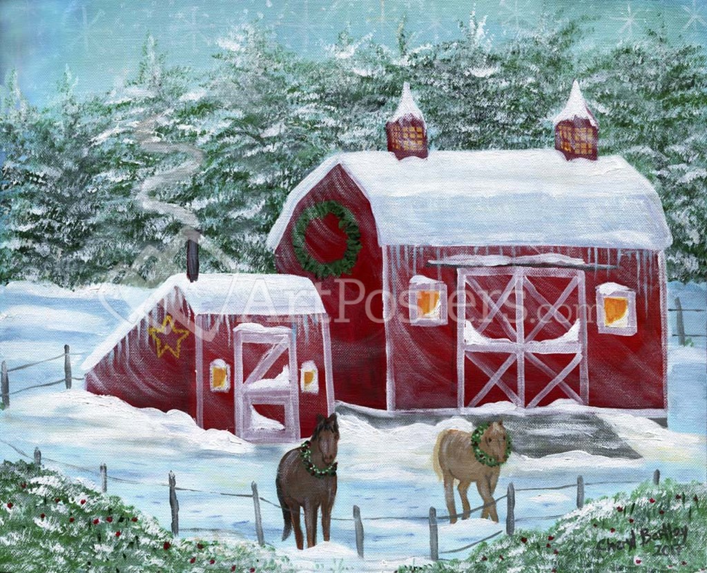 Title: Winter Horses by Red Barn